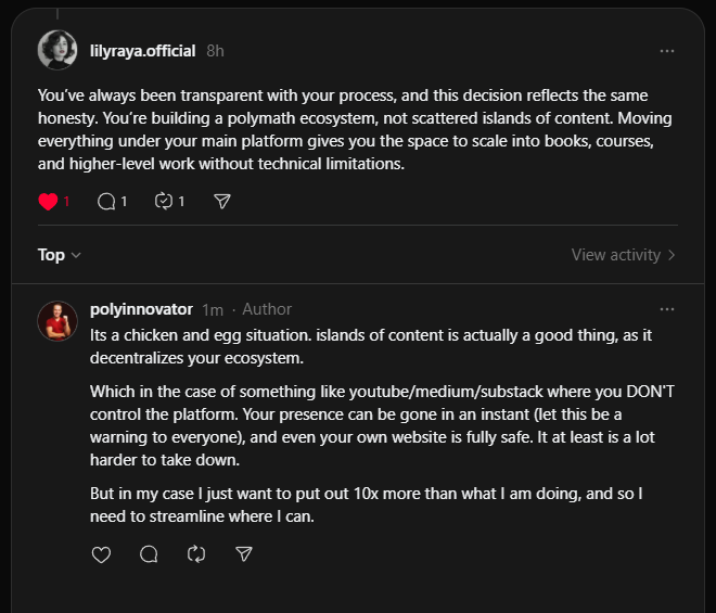 I'm bringing back my Substack into my Ghost CMS fold, and while that has nothing to do with my platform apprehension. It does limit me in the sense that putting everything onto one site can be a bit risky. Let me explain.