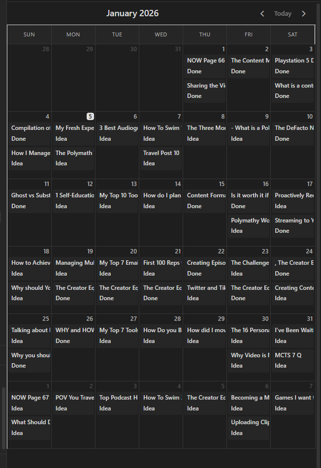As you could tell from the picture, every day is filled with something, if not a couple things. I've already made a couple mistake days, which means I missed a piece, and I was easily able to drag it to the next slot. Just like how I was able to in Notion, but now I have more ways of interacting with that same data.