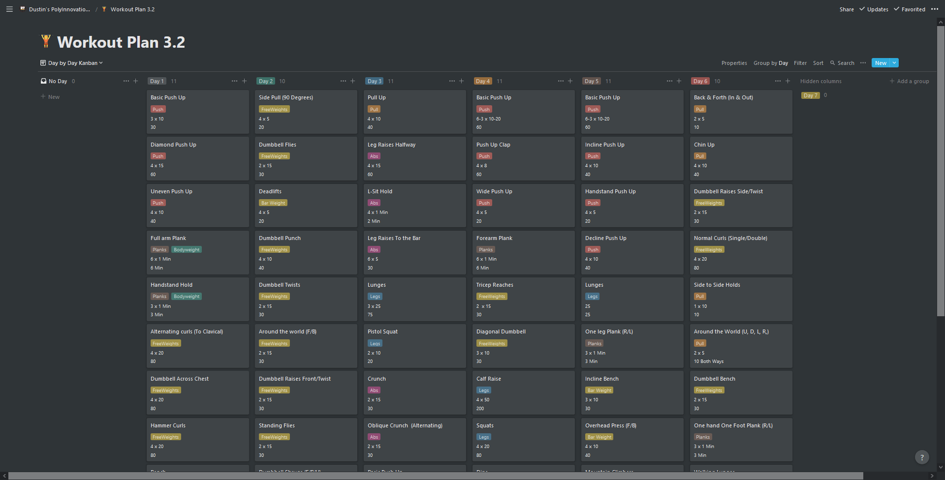 I'm thinking of reworking this one, but this is how my workout is set up. Using the kanban board as days of the week. That way I could move it around, and see it holistically.
