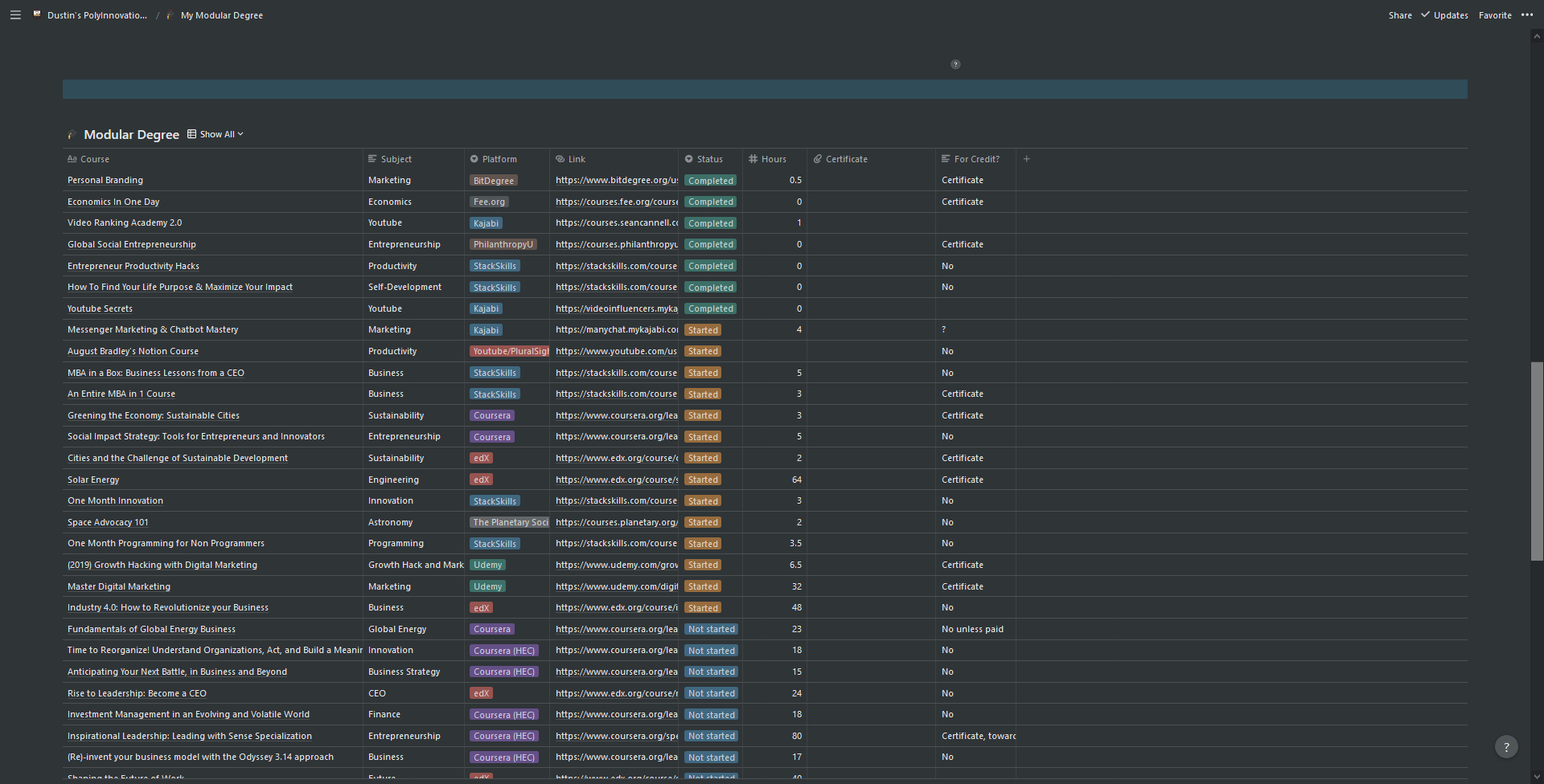 The Modular Degree is the concept I've been building out, and even on Airtable it may have had more functionality with the groupings. However I'm still developing this template that I will make public at some point.
