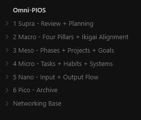 Using plugins to fill in the gaps has made a huge difference. I feel that the layers of the PIOS fit even better into Obsd. While they were made for Notion at first, they are applicable to most PKM tools out there.