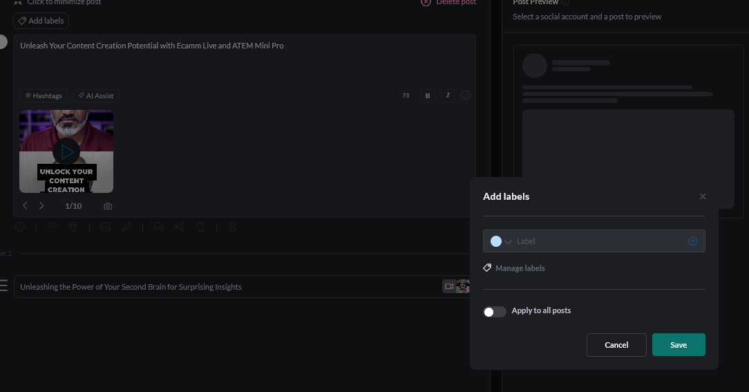 From here you choose your profiles, or profile groups (i.e. my main PolyInnovator channels for PolyCast clips, or the gaming channels for gaming clips). Make sure you choose a label.