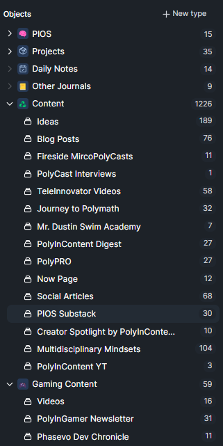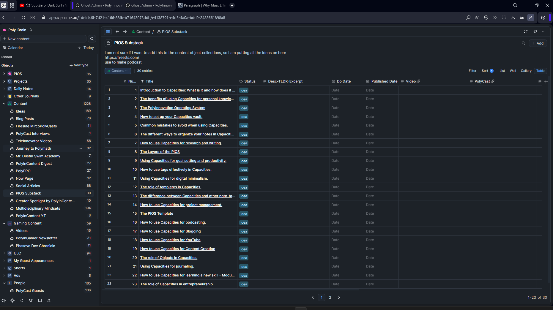 Notion had been the strongest in my opinion, as I was able to make a complex database to house the PolyInContent Ecosystem. However when I came across Capacities I realized their "Object based notetaking" would be a far stronger solution.