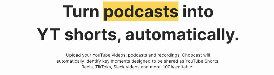 Upload your YouTube videos, podcasts and recordings. Chopcast will automatically identify key moments designed to be shared as YouTube Shorts, Reels, TikToks, Slack videos and more. 100% editable."