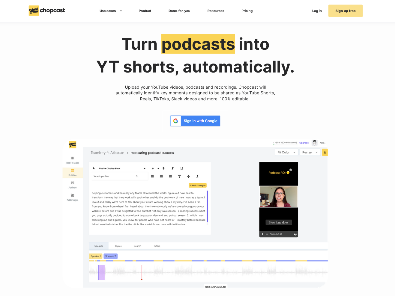 Upload your YouTube videos, podcasts and recordings. Chopcast will automatically identify key moments designed to be shared as YouTube Shorts, Reels, TikToks, Slack videos and more. 100% editable."