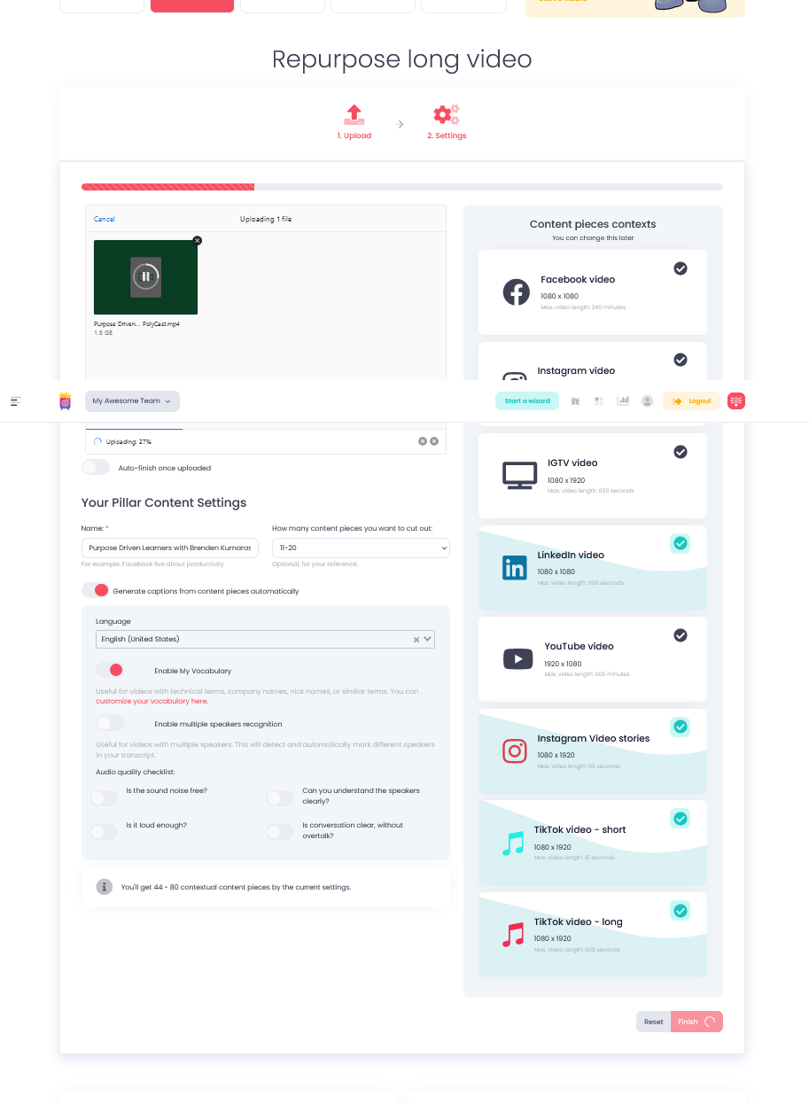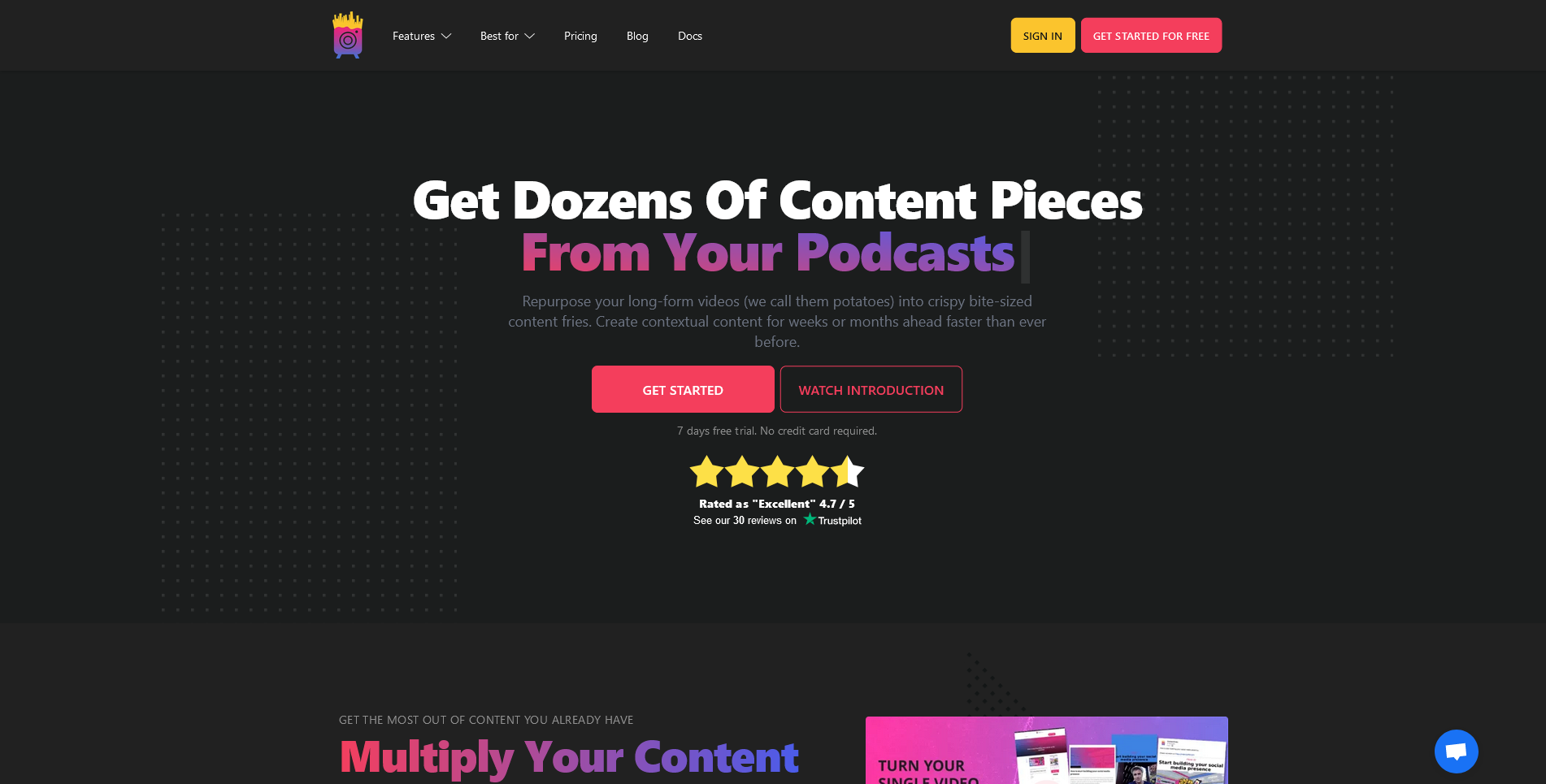 "Repurpose your long-form videos (we call them potatoes) into crispy bite-sized content fries. Create contextual content for weeks or months ahead faster than ever before."