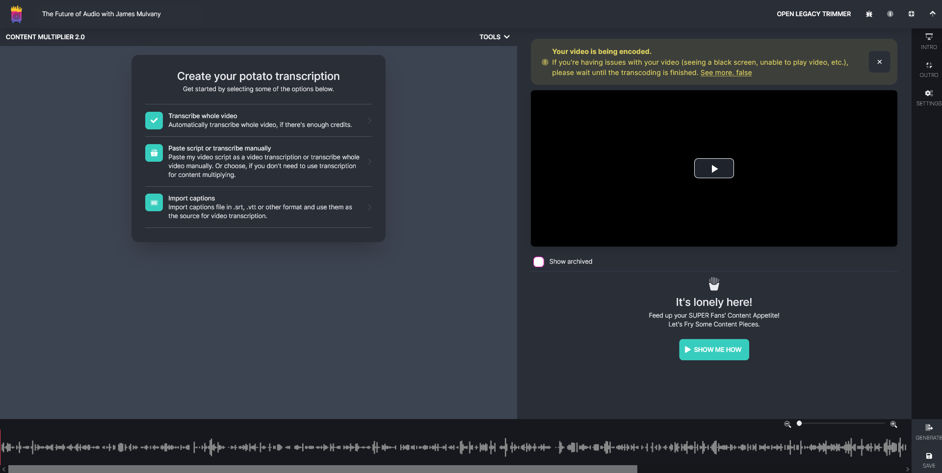 First Screen of the editor, loading in transcript, and encoding the video
