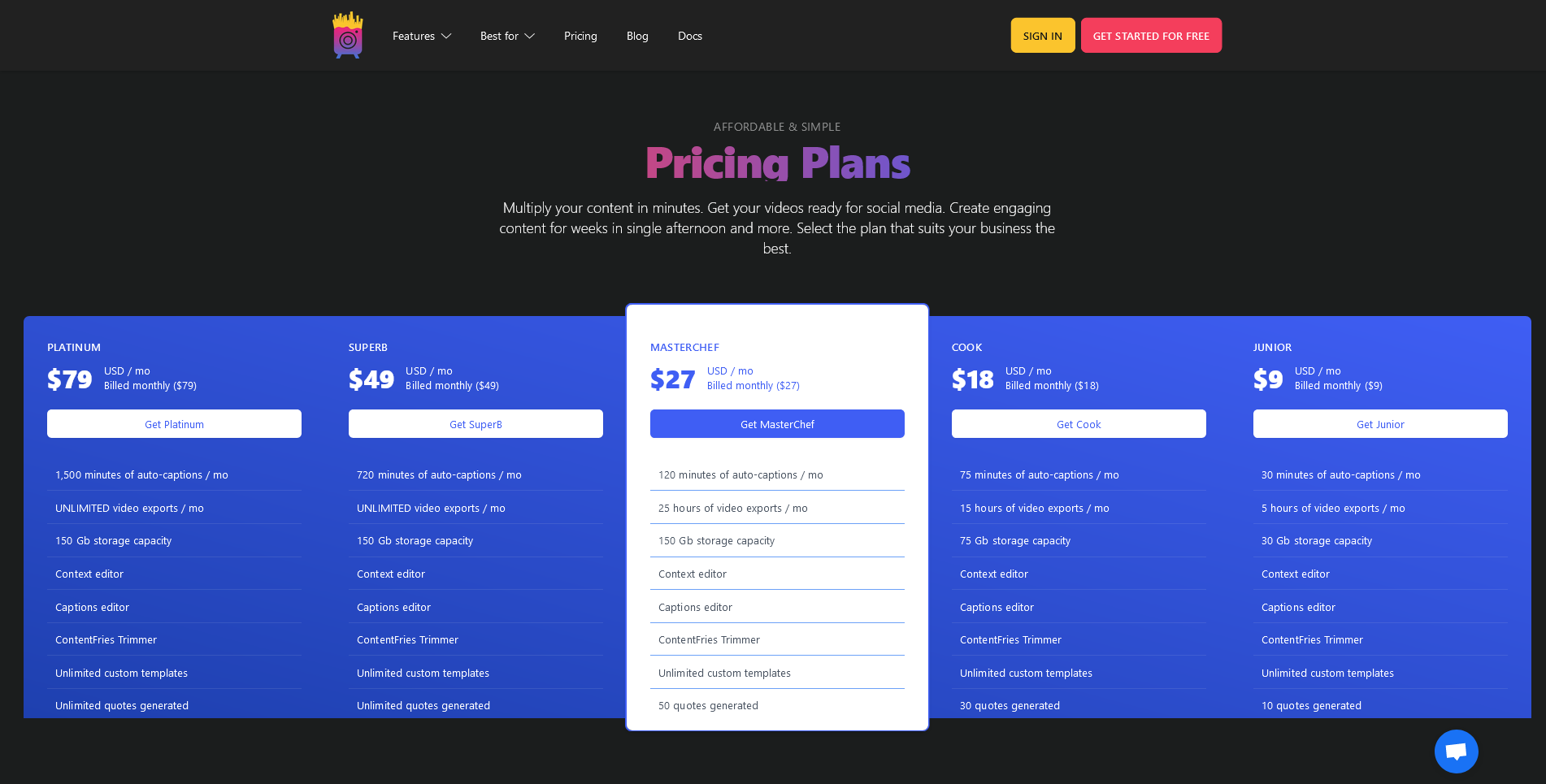 I love the cooking references given the "fries" motif. The various pricing plans give users the options to go for what they need.