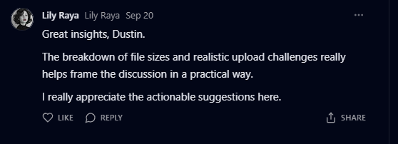 On average for me a blog post is anywhere between 4kb to 1mb depending on how long it is, and if it had images or not, etc. Very small, and that shouldn’t be difficult for anyone to upload even on dial up (hence why blogging was so popular in the late 90s/early 2000’s).