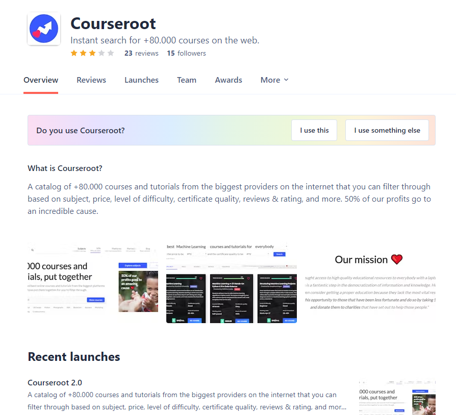 A catalog of +80.000 courses and tutorials from the biggest providers on the internet that you can filter through based on subject, price, level of difficulty, certificate quality, reviews & rating, and more. 50% of our profits go to an incredible cause.