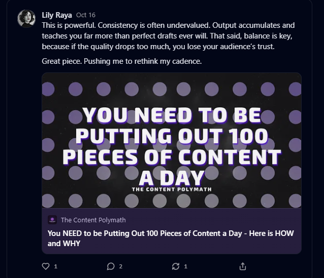 This is powerful. Consistency is often undervalued. Output accumulates and teaches you far more than perfect drafts ever will. That said, balance is key, because if the quality drops too much, you lose your audience’s trust.