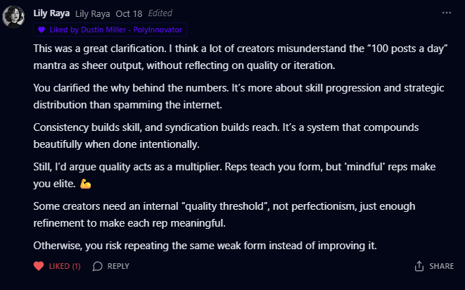 This was a great clarification. I think a lot of creators misunderstand the “100 posts a day” mantra as sheer output, without reflecting on quality or iteration.