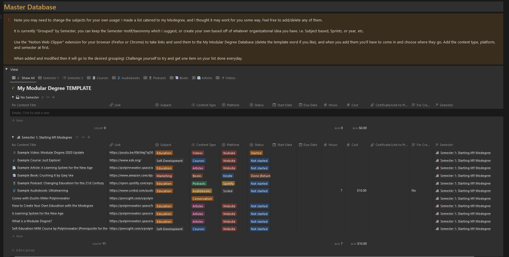 You can use the Notion WebClipper to gather links that you find to be useful towards your degree. Sadly it wasn't around when I got started, so I had to MANUALLY input every title, link, cost, hours, etc.
