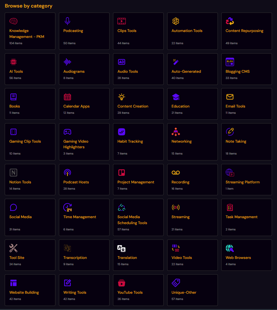 The other level of complexity is the various vast array of tools and tool categories I've amassed. I started using Airtable for the database, and so I wanted to use something to make a site from that. However the tools failed, and same for the notion tools too.