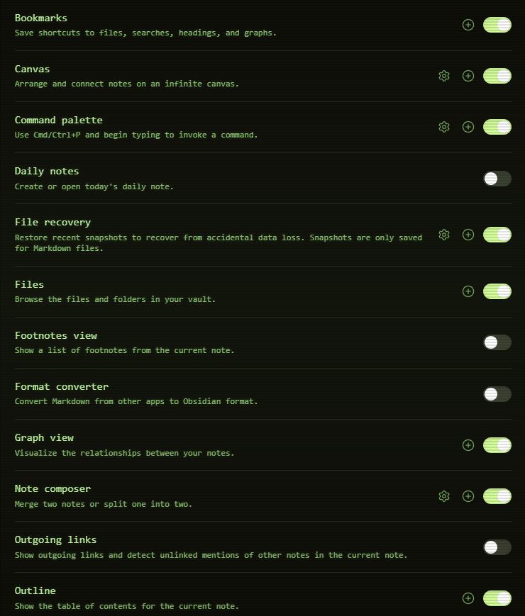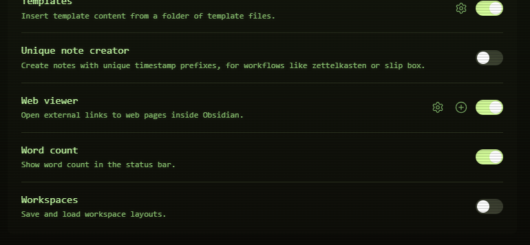 I'll include the screenshots of the core plugins just to paint the picture first. Ignore the coloring as I have a special theme installed to make it look more like a CRT monitor/ Fallout.