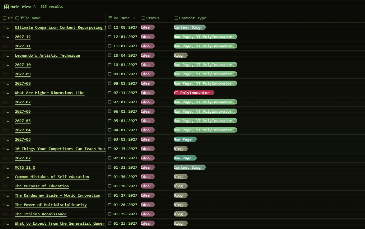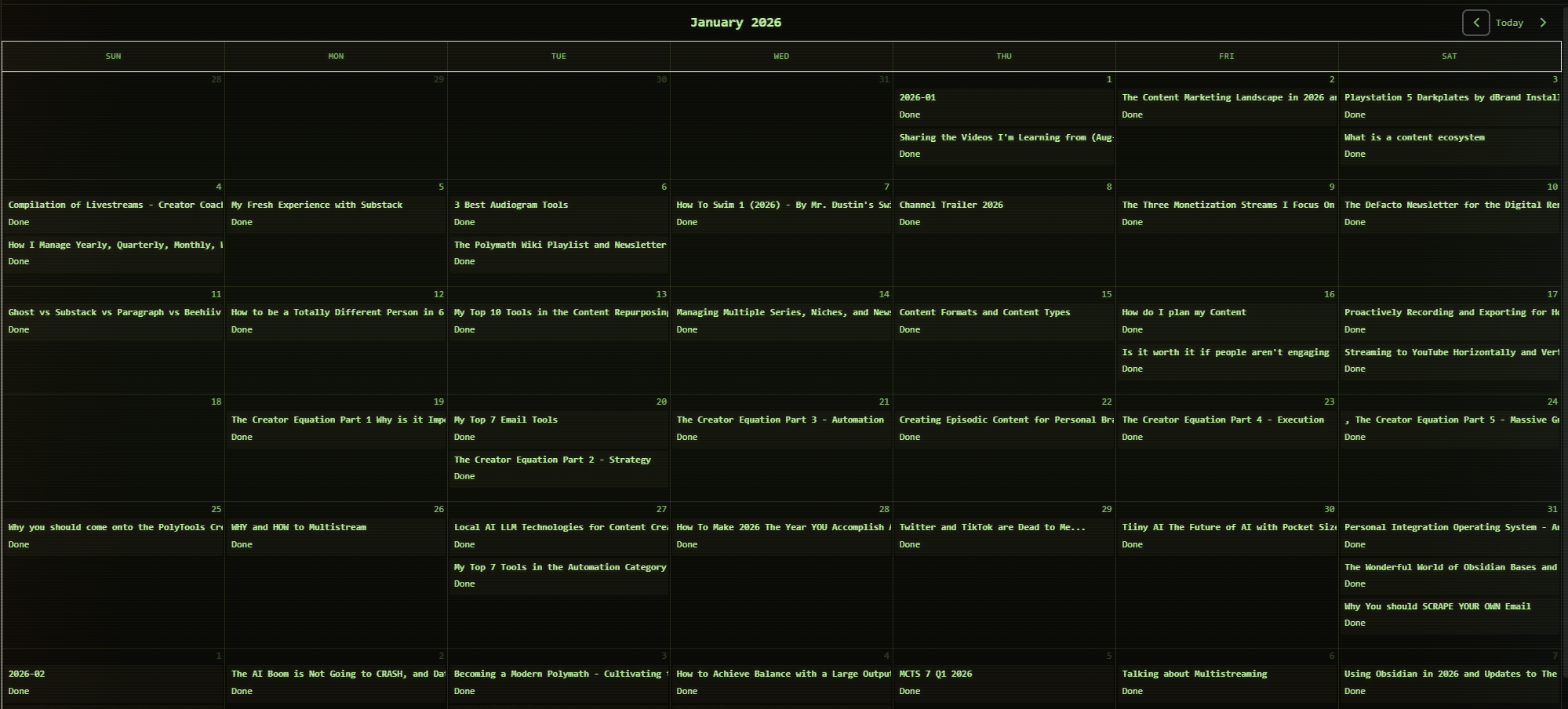 While there was a kanban plugin for a long while, it isn't merged with the Bases feature. I also never had a working calendar plugin in Obsd before, and I wanted to plan out my whole 2026 year worth of daily content. Since it is a content plan, then I wanted to see it visually on the days. This gave me a way to see it on a month view for example.