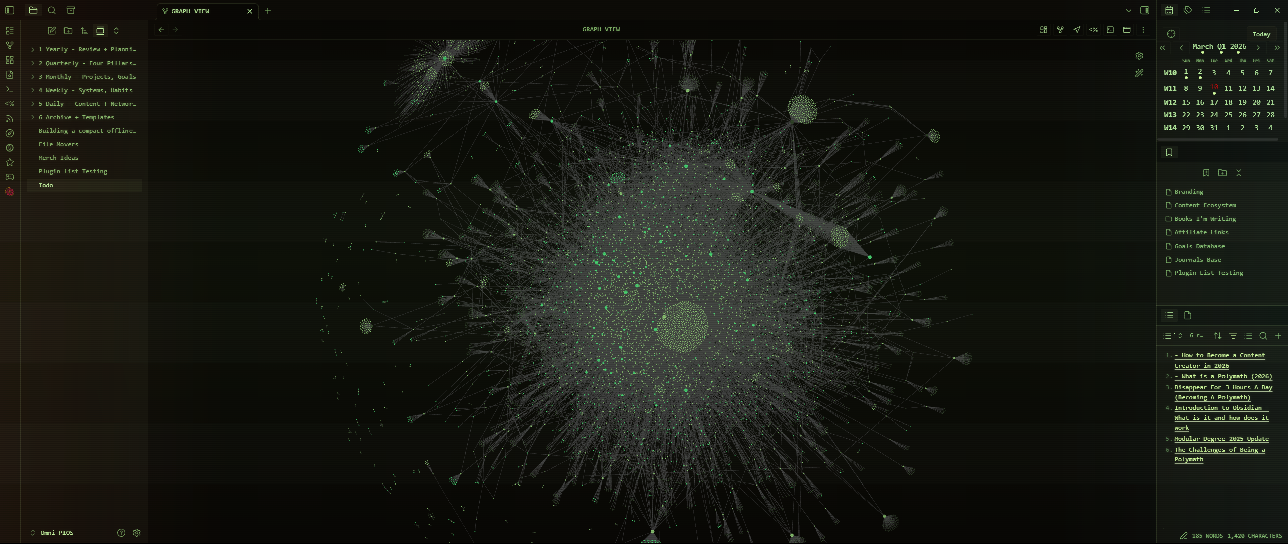 Do not feel overwhelmed by the screenshot, there are a lot of things to take in when you see that. I wanted to show you what my vault looks like, and some of the possibilities from the app itself (i.e. the special calendar on the top right).