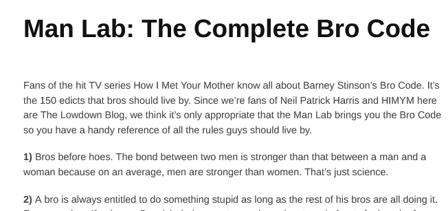 I thought this would be a good place to start given how prevalent it is in young men's lives. I've even been known to cite the bro code from time to time, and there is nothing wrong with that.