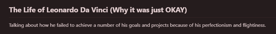 I don't want to be that person, and even my hero Leonardo Da Vinci; A prime example of a universalist polymath; He lived an okay life I would say, which is sort of a deep thing to say here (I'll make a post about it later).