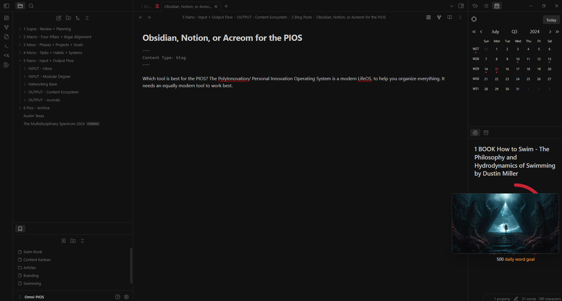 The PIOS is a perfect fit for Obsidian.md, and although it took 3 tries for me to fully start using Obsidian. I am so glad I did make the switch.