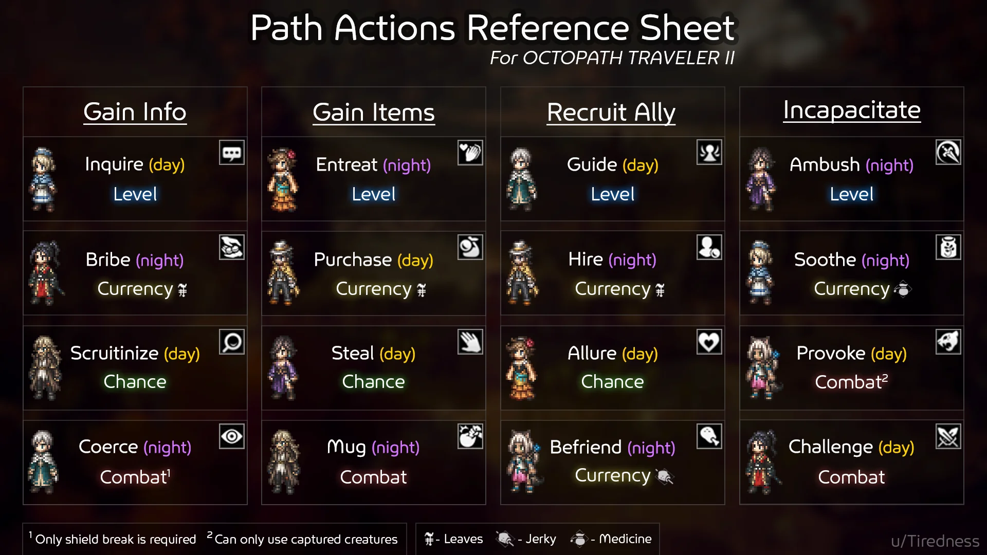 - Day: Entreat/Beg (Being that of a nomad and hero, people are willing to give him items/food)