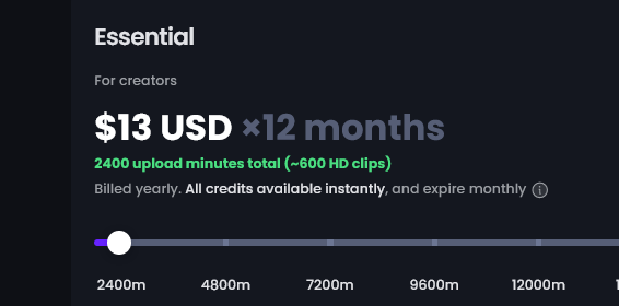 The price does jump down quite a bit for the most basic option when you go to yearly. Although depending on how long your videos are, you might eat up that amount rapidly.