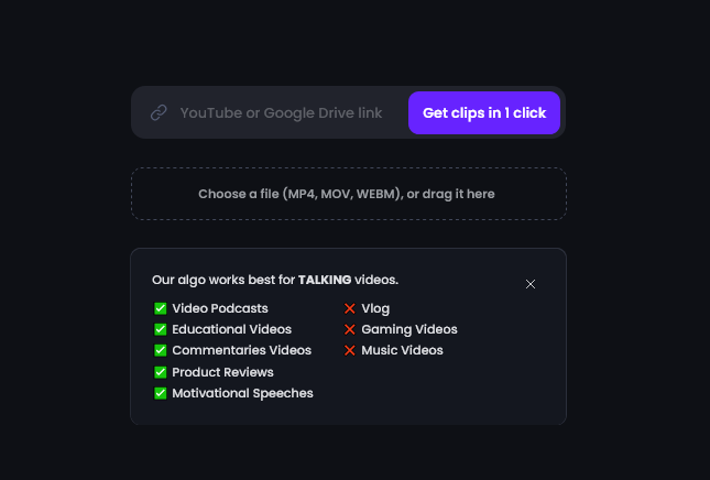 With Opus if you have a lot of videos in the backlog, such as how I did (over 200 videos, not just my interviews), then all you have to do is simply drop a youtube video link. A good 33% of my interviews were on Zoom prior to moving to Riverside, and some of my Riverside ones were made before their update. Meaning I can't use the Clips feature on them. A small issue, but Opus can be used then for those videos.