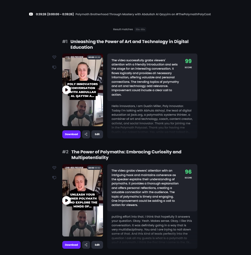 Although I really want to clarify just how many a 100 videos are. Those are all hour and a half long podcast episodes on average. From those I was able to generate over 1300 clips from this platform that I will be scheduling out over the next FEW HUNDRED days.