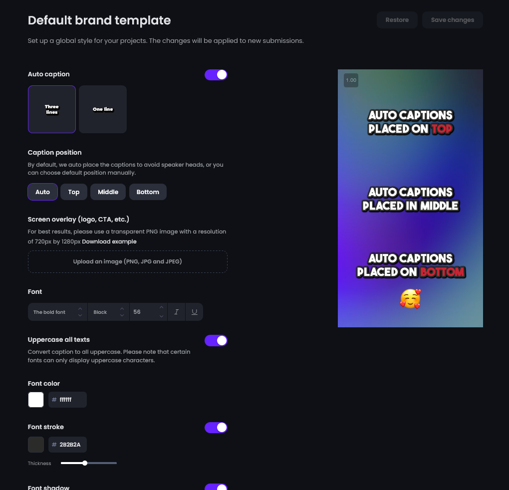 When they first launched they didn't have a brand template feature. Meaning I had to go into each clip and change the colors, and make it reframe into the style I wanted. Now I set the brand template, and it automatically applies to all clips of a video that I have done.