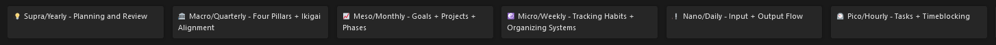 While the Supra/Yearly layer gives you a broad picture to work with, and the Pico/Hourly gives you the nitty gritty details to account for; In the middle you have the Meso/Monthly or Micro/Weekly, that you probably will spend most of your time in. They are your bread and butter, and the Meso in particular allows you to organize your plans each month into actionable steps.