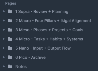 Now I've made some changes since the last time I talked about the various layers. After moving from one tool to 3 or more at this point. I have experienced many different applications OF THIS system. Meaning that while some things worked or translated well, there were some things that didn't. Take the Pico layer for example. I always sort of saw it as the hourly, or time tracking layer, but that wasn't useful. Given how tasks were already in Micro layer anyways.